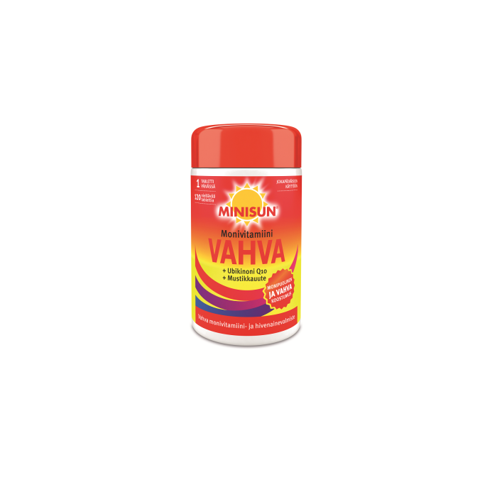 Minisun monivitamiinit ovat helppo tapa turvata päivittäinen vitamiinien ja hivenaineiden saanti ympäri vuoden. Minisun Monivitamiini Vahva on suomalaisille suunniteltu aktiivisen ihmisen monivitamiinivalmiste, joka sisältää vahvan annoksen erityisesti vastustuskykyä vahvistavia vitamiineja. Vahva koostumus antaa lisäenergiaa joka päivä: valmiste sisältää muun muassa reilun annoksen D-vitamiinia, kalsiumia, B12-vitamiinia, foolihappoa ja sinkkiä. Lisäksi tuotteessa on ubikinoni Q10:tä ja mustikkauutetta. Minisun Monivitamiini Vahva sopii erityisesti aktiiviselle aikuisille, liikkujille, stressistä kärsiville ja ikääntyville. Yksi nieltävä tabletti päivässä riittää. Tuote on laktoositon, soijaton, liivatteeton, hiivaton ja maidoton. Ei sisällä gluteenipitoisen viljan ainesosia.